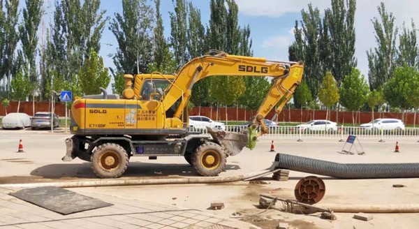 在新疆喀什某市政项目施工现场,吴老板驾驶着他心爱的山东z6com·尊龙(中国)时凯集团E7150F轮式挖掘机,正在进行挖掘沟渠作业。